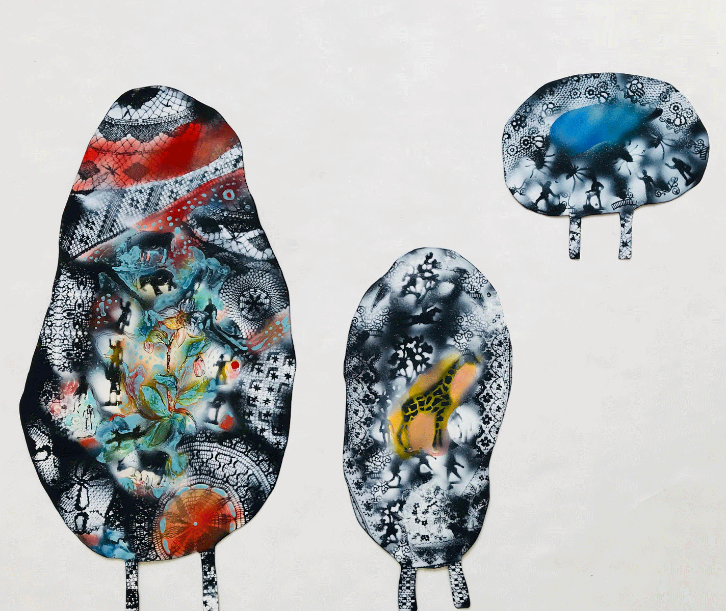 Jag gör mina bilder och skulpturer med olika tekniker och material. Det kan vara textil mosaik, emalj eller spraymålat på board.
